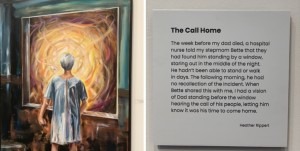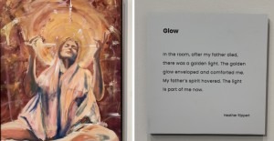 Jodi, arrived and we exchanged lovely friendship hugs and greetings and I told her about the two people. Next, we walked back to ’The Chapel’ as I call it. Thanks to Interim Gallery Director, Beth Gelman’s, thoughtful curation of our art, my six pieces are grouped together in a nearly private space towards the back of the galleries. The space creates a sacred feel to my series of deeply personal paintings. Sue and Dave (the two on bikes) were already there, as well as some other guests enjoying the Emerging Artist Exhibit.