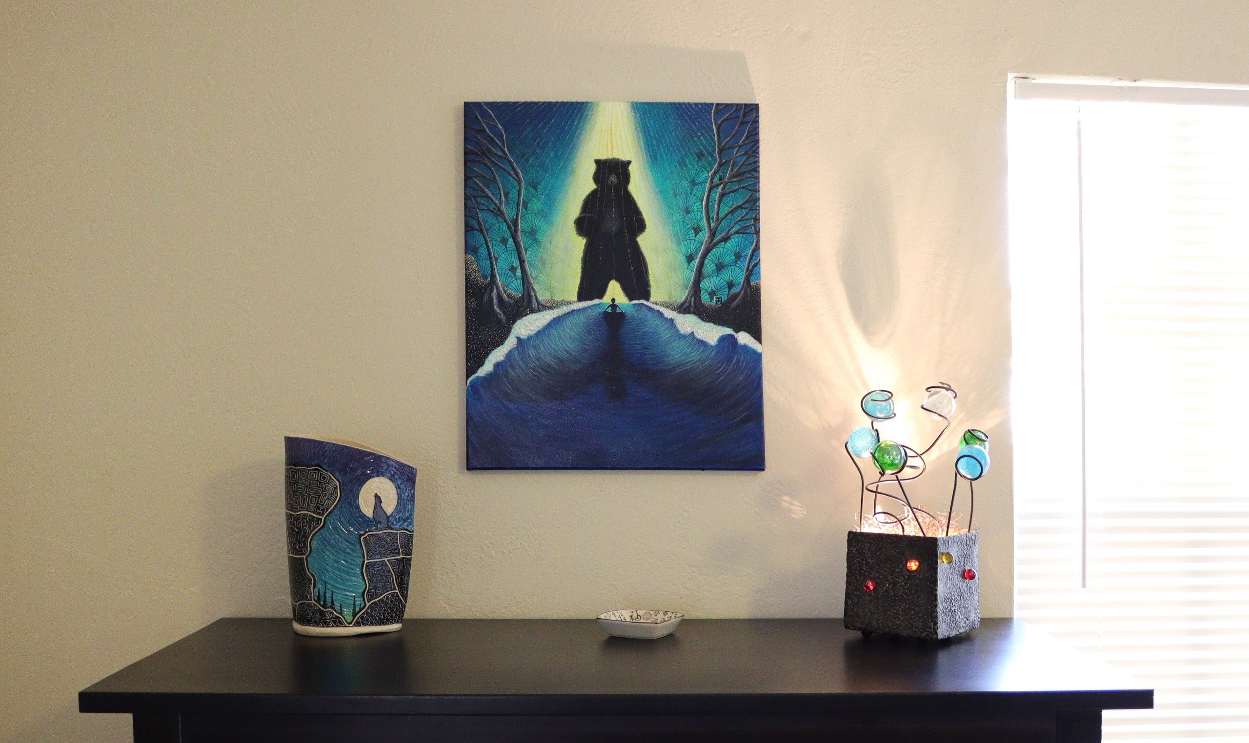 The acrylic painting in the middle is a piece I created in 2020 during the pandemic. It was an extremely isolating time for me working and living alone at home. But the tension and fear from everyone around me was extremely strong. So, I directed that energy into this painting. It represents holding space when you are confronted with fear.