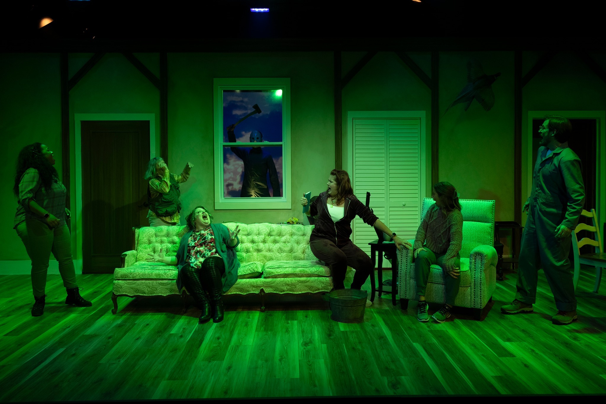 In Symons’ script, the “Hollywood Housewife” of McGee’s original idea has become a has-been actress. Her scandal? Britney Cox (played by Kristin Carbone) was cancelled from an off-Broadway show (way, way off Broadway, in Buffalo, in fact) because she was exposed as falsely posing as a trans lesbian to get into the show. To escape the media fury that ensued, she books a Mystery Weekend at an AirBnB in the Berkshire’s with three women who work for her.