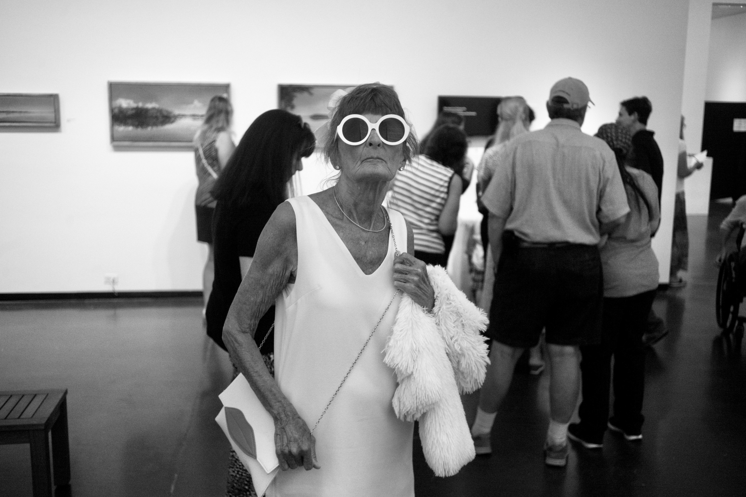 The photographer steps in, when, at the very second the art being viewed turns the viewer’s face into an art influenced by art, another expression of the artist or shall we say: the complete gift of art to the viewer. The artist needs art and the art needs the artist, face to face, to pull understanding, an ancestral continuance, from the reciprocity of what it takes to have a creative exchange. The purpose of the laboratory is to destroy boredom. A room full of awakening questions pulled from fascination; that’s what an Exhibition Opening is. To say portal, to say pore. An opening is an entrance and an exit––the begin end of an endless beginning. Two-way support. A face is energy. A face is frequency. Skull walls covered in the craft of soft magnetism. Each expression denotes an era, another grant cycle. Art drinks, without draining, what the viewer thinks. Art reads the room, sweeps it like a kind broom, like the colorful mission of black and white pigment. The only thing preventing the grid from going down: Art.