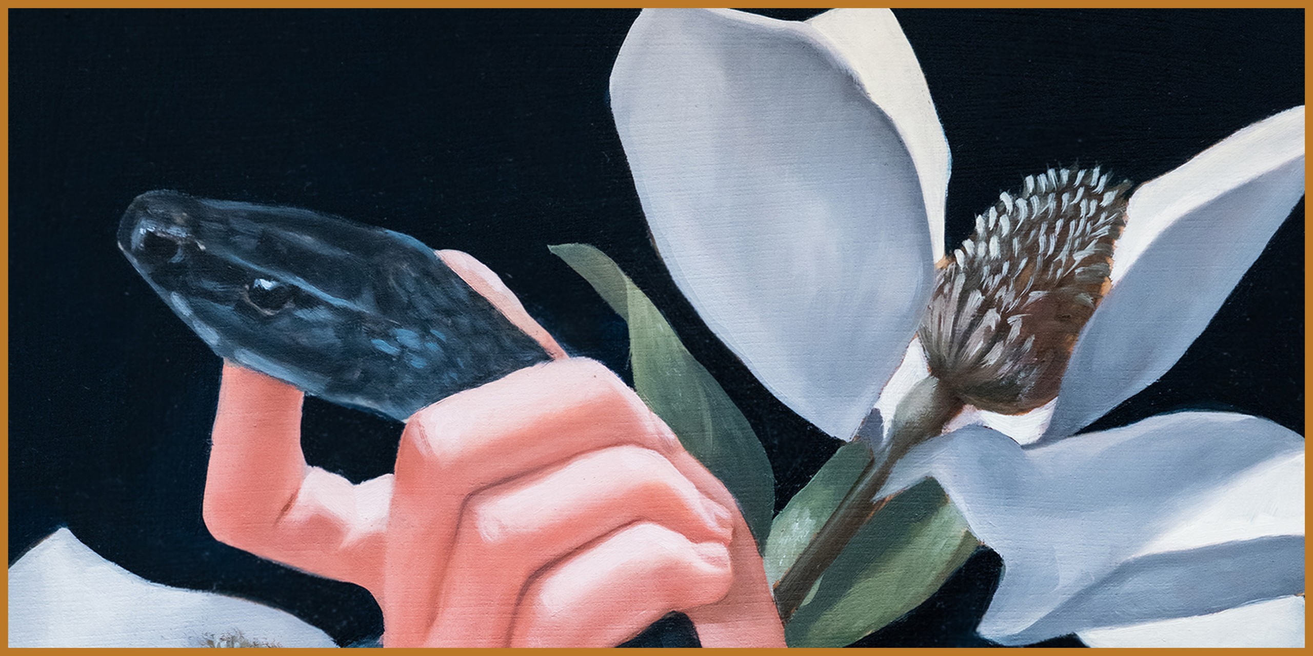 Surrounding the hands and snake, magnificent magnolias bloom, serving as a metaphor for the stability and strength that emerges from the process of healing through grief. Their delicate petals symbolize the beauty and resilience that can be found in the midst of emotional turmoil. The intertwining of the hands, snake, and blossoms signifies the interconnectedness of our experiences and the transformative power of embracing vulnerability.