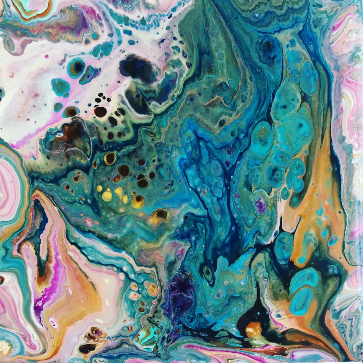 When I started doing the fluid acrylic pours I learned a new way of painting that included friends and family. “Pours” are a simple process of layering different color paints in a cup and adding a few drops of silicone or oil. When you flip the cup onto a wood panel or canvas the paints flow into each other while the oil creates unique cell shapes. It’s a lot of fun and my daughters could make beautiful backgrounds with me through such a simple process.