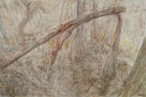 My drawing materials include natural wood charcoals and natural red chalk. My charcoals are hand-made from local woods. This painting, “Swamp Space in Late Afternoon” (2018) was completed en plein air in a cypress dome in Tarpon Springs. The composition follows the arc of a fallen cypress tree.