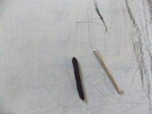 I find fallen twigs of various woods, such as cypress, shave off the bark with a utility knife, wrap in foil and carbonize in an oven. Carbonized charcoal as a drawing material was described by Cennino Cennini in Il Libro Dell’Arte, a book of Italian Renaissance art formulae. Its usage for art is prehistoric, practiced by ancient cultures all around the world. Below is a sample of my drawing instruments for the work in progress.