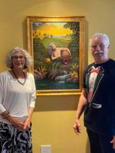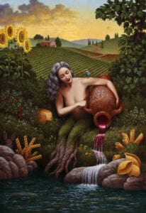 We were making progress. The clients were pleased but asked for a few changes: 1) remove the jumping fish and make fish visible below the pond surface, 2) add sunflowers, cheese, grapes, mushrooms, tomatoes, and basil, 3) a Tuscan landscape background with colorful sky, and 4) a jetliner in the sky as an allusion to the wife’s years spent as a stewardess. Also, the woman’s hair must be a silvery gray color. No problem!