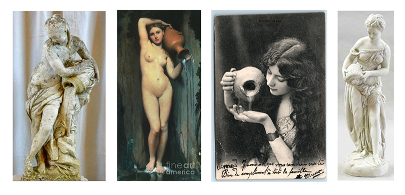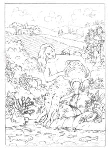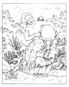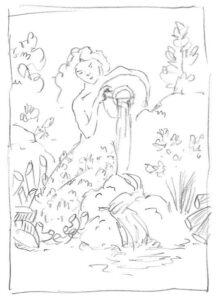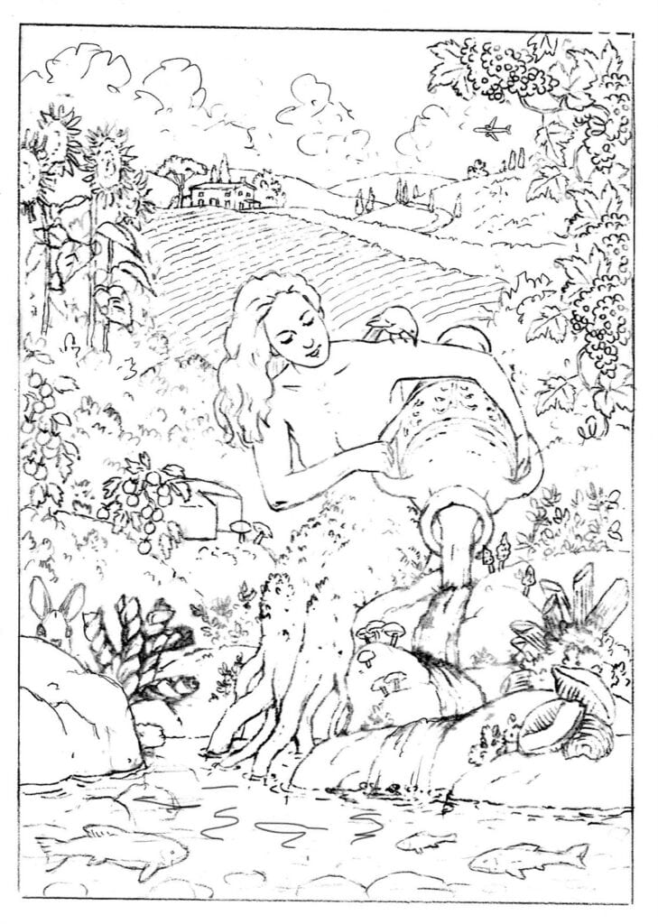 Below is one of several quick sketches I did to get the ball rolling. The main focus would be a half-woman, half-tree figure seated on the edge of a pond pouring wine from an ancient Roman jug. Since my clients love food and the wife is a fine cook, the surrounding landscape would include sprouting pasta shapes and fish in the water.