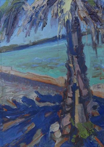 My husband and I had the opportunity to rent a house on the Pinellas Trail in Dunedin for 6 months. I spent most of my time drawing and painting in the outdoors – en plein air. I had a paint box and would cart it to the beach and do tiny oil paintings in one sitting. I also did mixed-media paintings with watercolor and acrylic often working from memory as the influence of the coastal sensations manifested into interesting compositions.