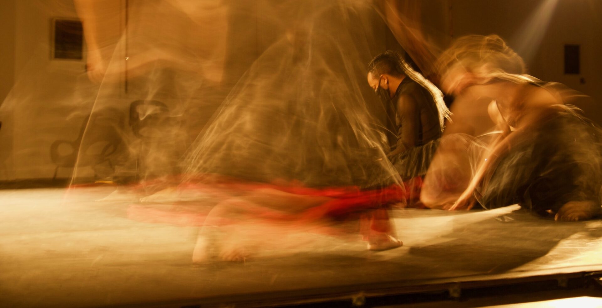 The dancers are agape with no mouths. Black fabric masks obscuring their faces. Just spiderwebbing from the lace and blackholes for eyes. We feel as if we’ve entered a sacred space. Flagged by four corners, Carissa Bishop’s center stage solo is calling up spirits. Once she breaks out into a run, her inertia takes leave of the room and behind her sprawls a vacuous, black stage.