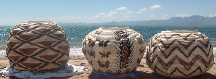 They are also known worldwide for their tightly coiled baskets, beautifully decorated with intricate patterns. For the basket making, the women use the branches of the Limberbush (Jatropha cuneata) separating them into long flexible fibers. The women are also credited with the making of beautiful multicolored necklaces from seashells, seeds, flowers, colored clay beads, and dyed vertebrae of snakes, birds, fish, and sharks.