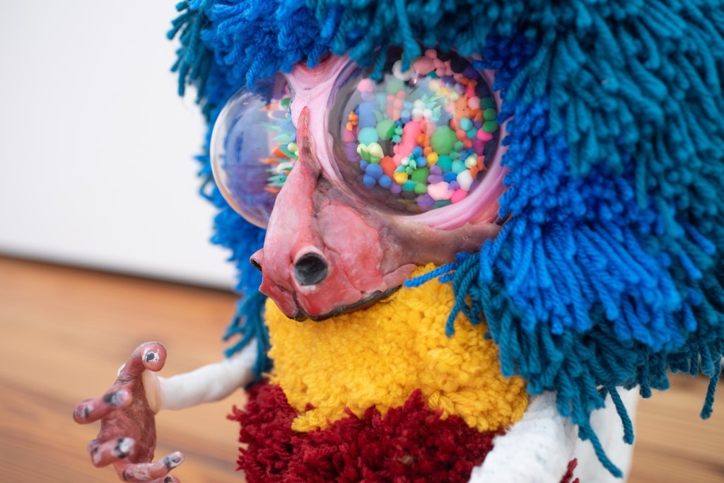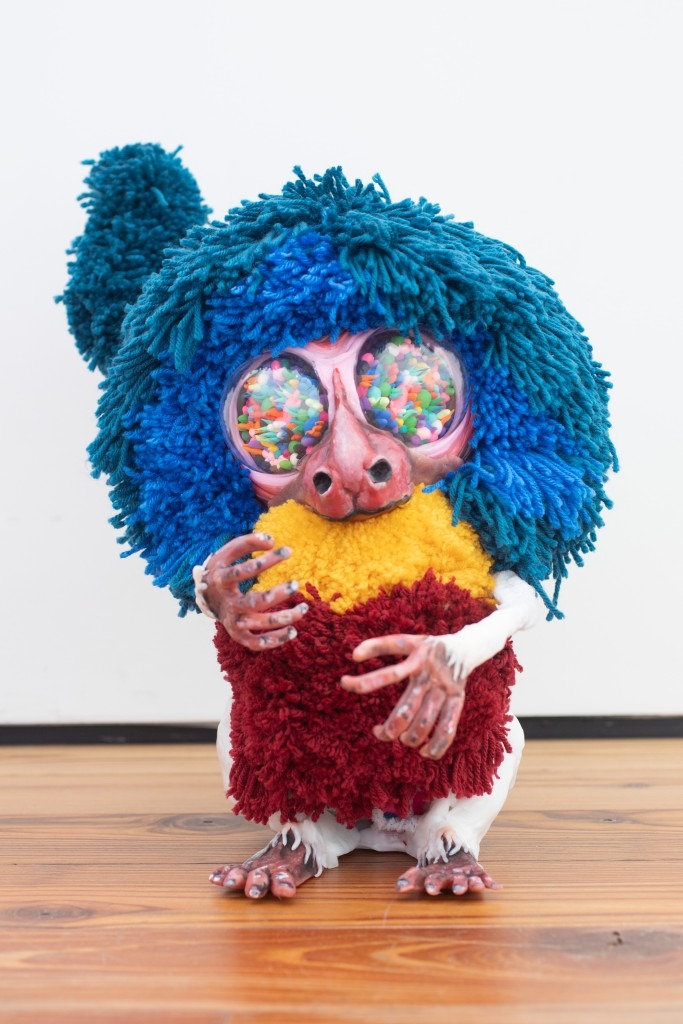 Samo Davis uses multi-colored materials like cotton pom-poms and melted plastic to sculpt extraterrestrials discovering new landscapes with the chromatic array and fantasy of Superflat artists like Takashi Murakami and Yoshitomo Nara.