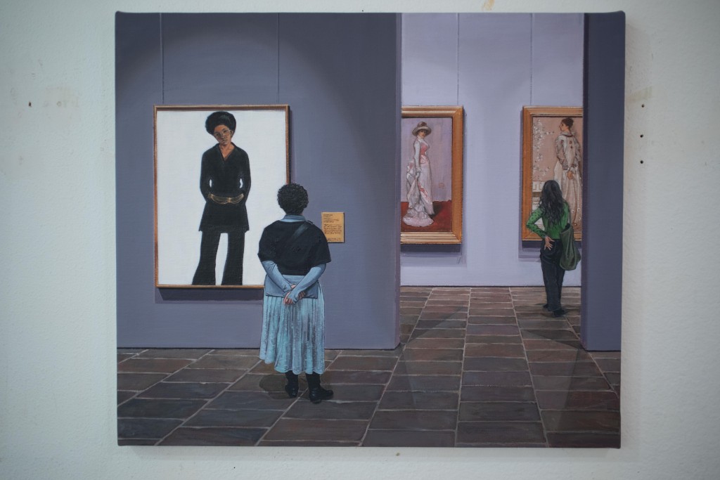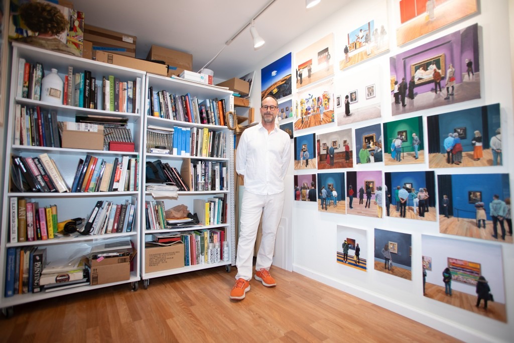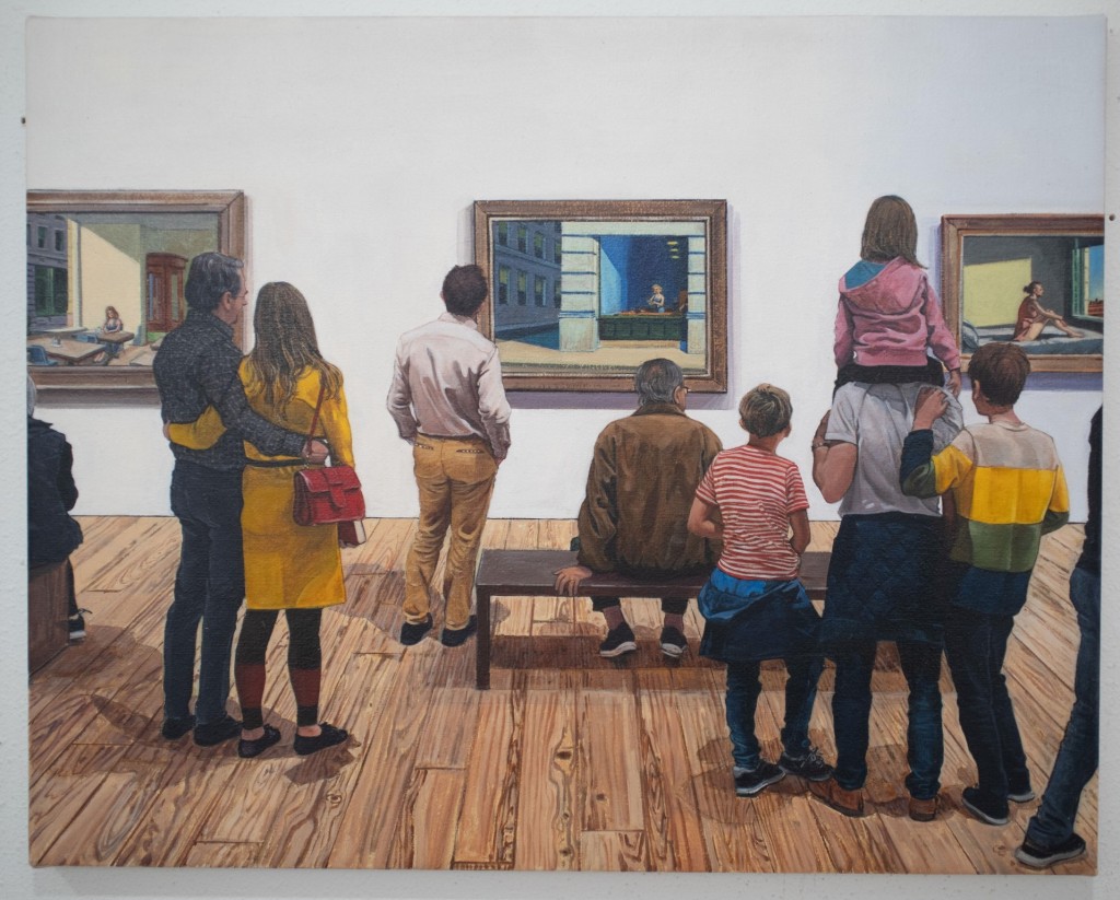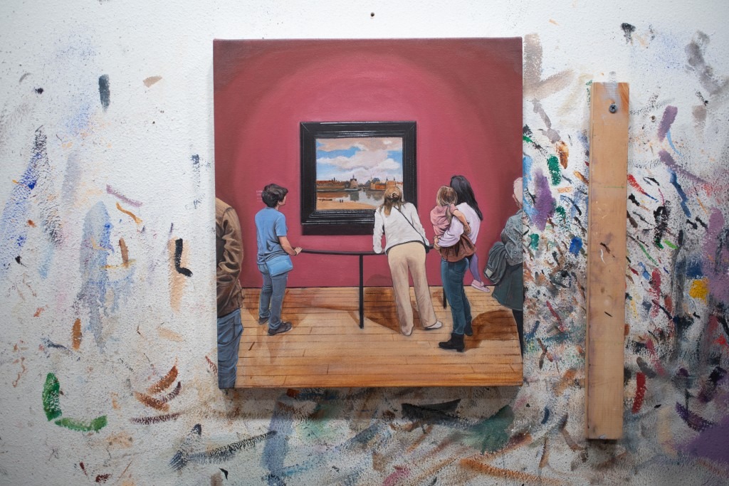 Fig sculpts hyper-realistic miniatures of artists’ studios, and paints viewers taking in art at museums and galleries with a kind of realism and figuration that recalls the Dutch Masters.