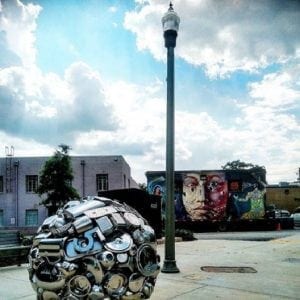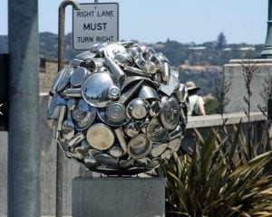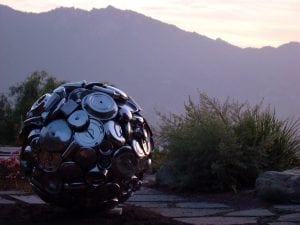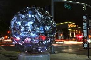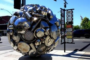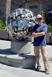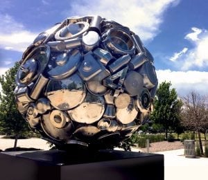 Reprocessing Orb #abstract #art #sculpture #napa_valley This is another outdoor sculpture in Napa, Ca. It was created by Donald Gialanella. He chose Reprocessing Orb as the tittle of his sculpture. It was made from repurposed stainless steel household items such as pots and pans along with hubcaps. He welded them together to form a perfect sphere, which turned out to be 48 inches in diameter. It perches precariously on the corner of Third and Main streets in Napa, Ca. Photo by Bill Elder.