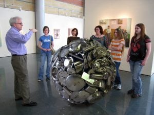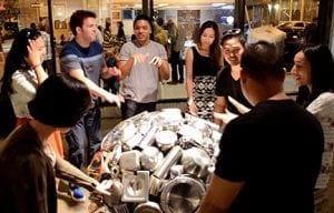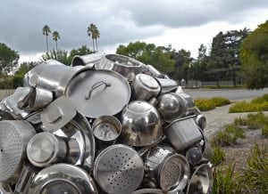 It is made up of common pots, pans, pet bowls, hub caps, coffee creamers and vessels of every