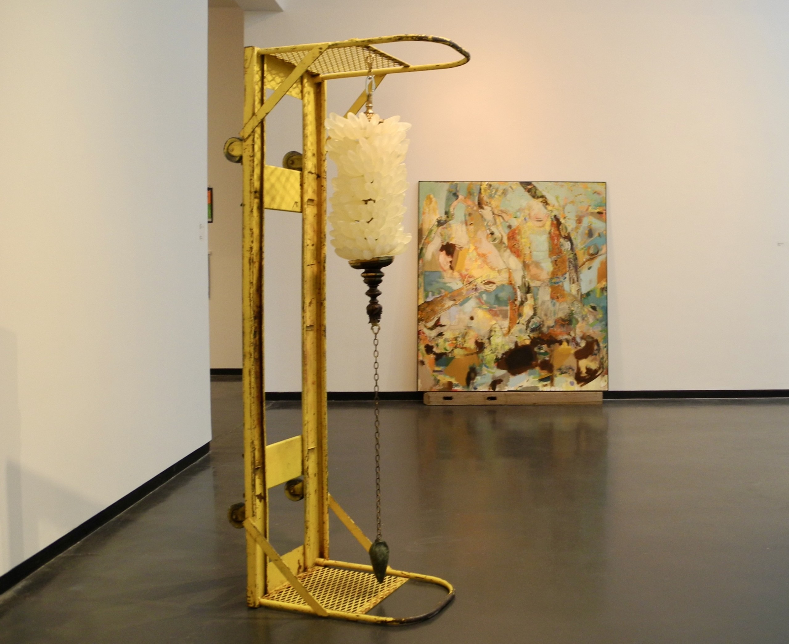 As we were about to roll down the warehouse door, she focused on a line of hand trucks mostly standing upright and she saw this very tall, yellowish metal cart and said, “What if we hung the banana chandelier from that?”