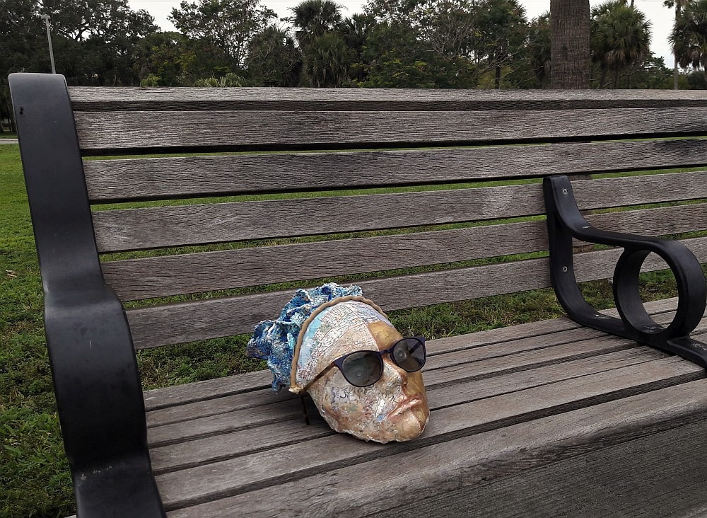 I took it out of the confines of the box and carried it to familiar places in the St. Petersburg area and took a “selfie”. It sat with my grandson on the benches along the beach front, it found a nesting place beside the trees and into the gardens and among the roots of an old Ficus tree. It went to the Dali Museum, where I completed my internship for my master’s degree. It found its place amongst the Spanish rocks, in front of the “closed sign” and by the glass window.