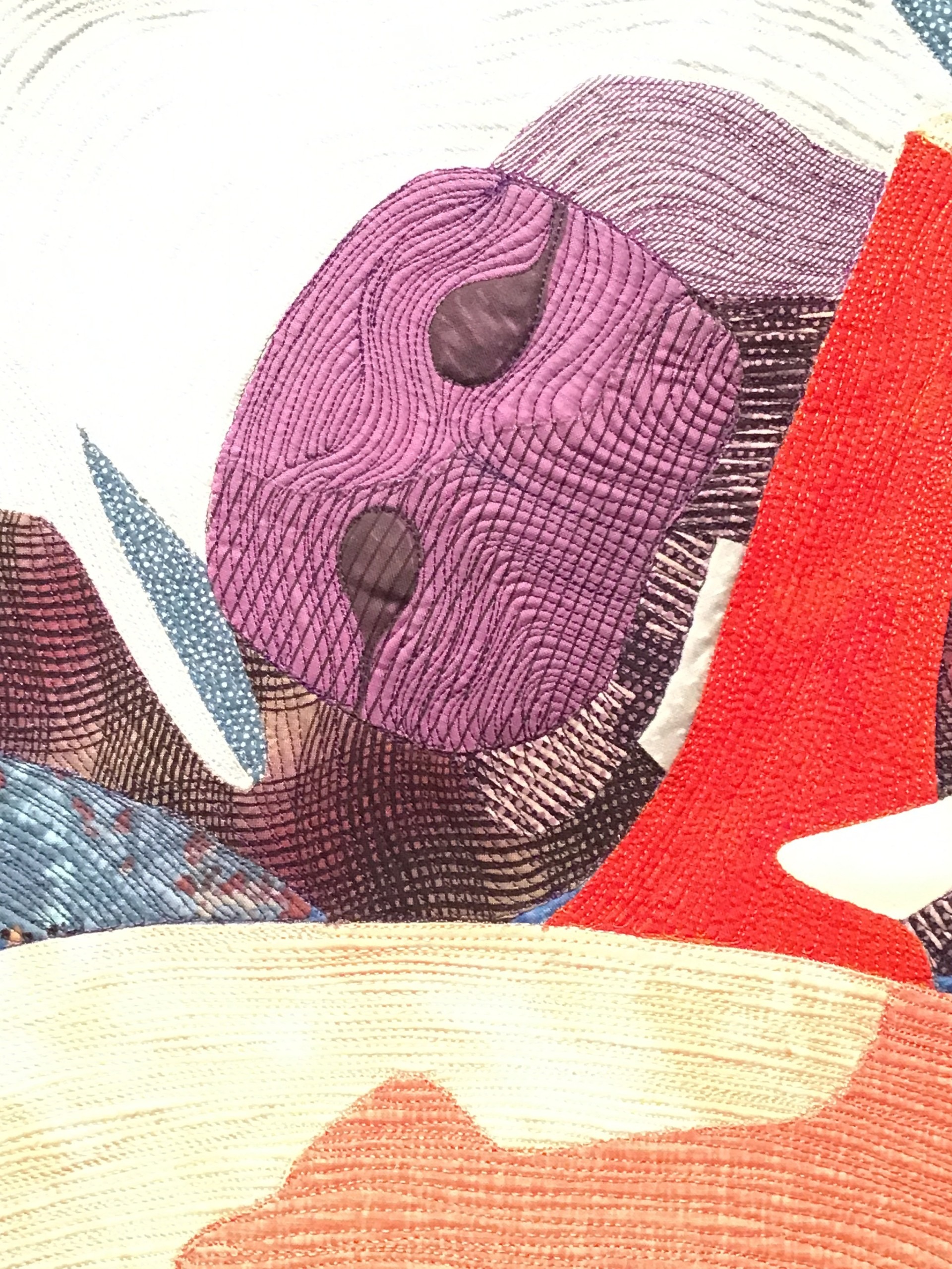 Mary Ann Pickard printed photos on cotton and machine quilted shibori and commercial batik fabrics and embellished her piece with white organza and blue jay feathers. Her piece depicts an “amazing” shelf fungus that came to grow “on a tree stump to take it back to the earth and nourish the new tree” (a tree Pickard planted).
