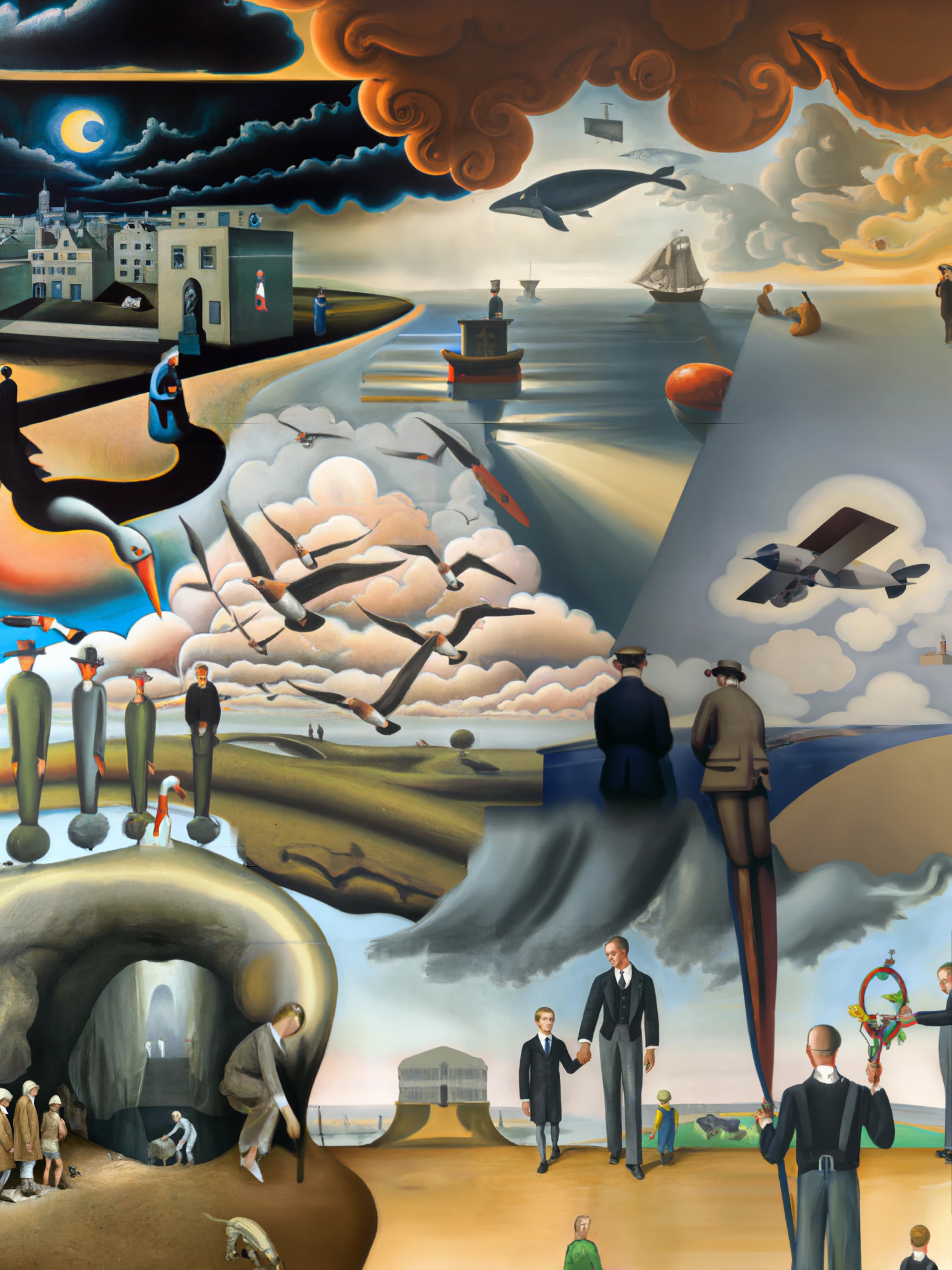 In the second gallery is an interactive project called Dream Tapestry. Using an artificial intelligence program named DALL-E, visitors can input their dreams, individually or as a group, and DALL-E will select images fitting to those dreams, weave them together into one montage picture – some even in style of paintings in the exhibition – that is projected onto the gallery wall.