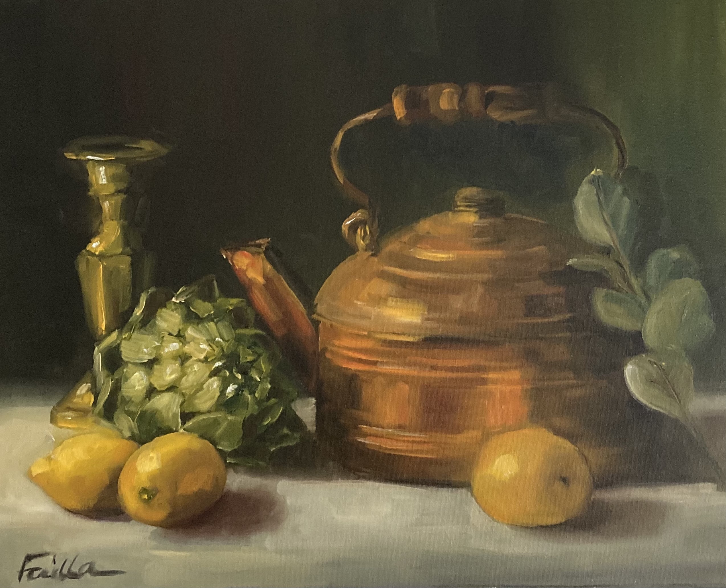 - Stay focused!! My style of art (classical still life) is not the most popular subject in the warm and sunny state of Florida. Many times, I thought “maybe I should be painting palm trees?” That falls under the realm of “negative thoughts” as mentioned in number 1 above. Stop it! The people who love what you create will find you if you promote enough, so keep promoting and stay focused on your style of art. The painting above, “Brass Candle and Copper Kettle”, was posted on Facebook and got noticed by a collector. It sold for mega-bucks. 🙂