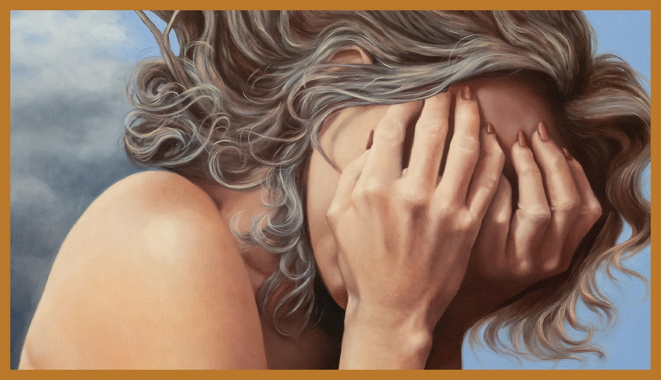 At the center of the composition stands a woman, her face hidden behind her hands, symbolizing the deep emotions of shame, fear, and embarrassment that often accompany the experience of trauma. However, in this vulnerable state, she is also engaged in a courageous act of facing her fears head-on. By allowing herself to mourn and grieve, she begins to peel back the layers of pain, gradually moving towards a path of self-renewal.
