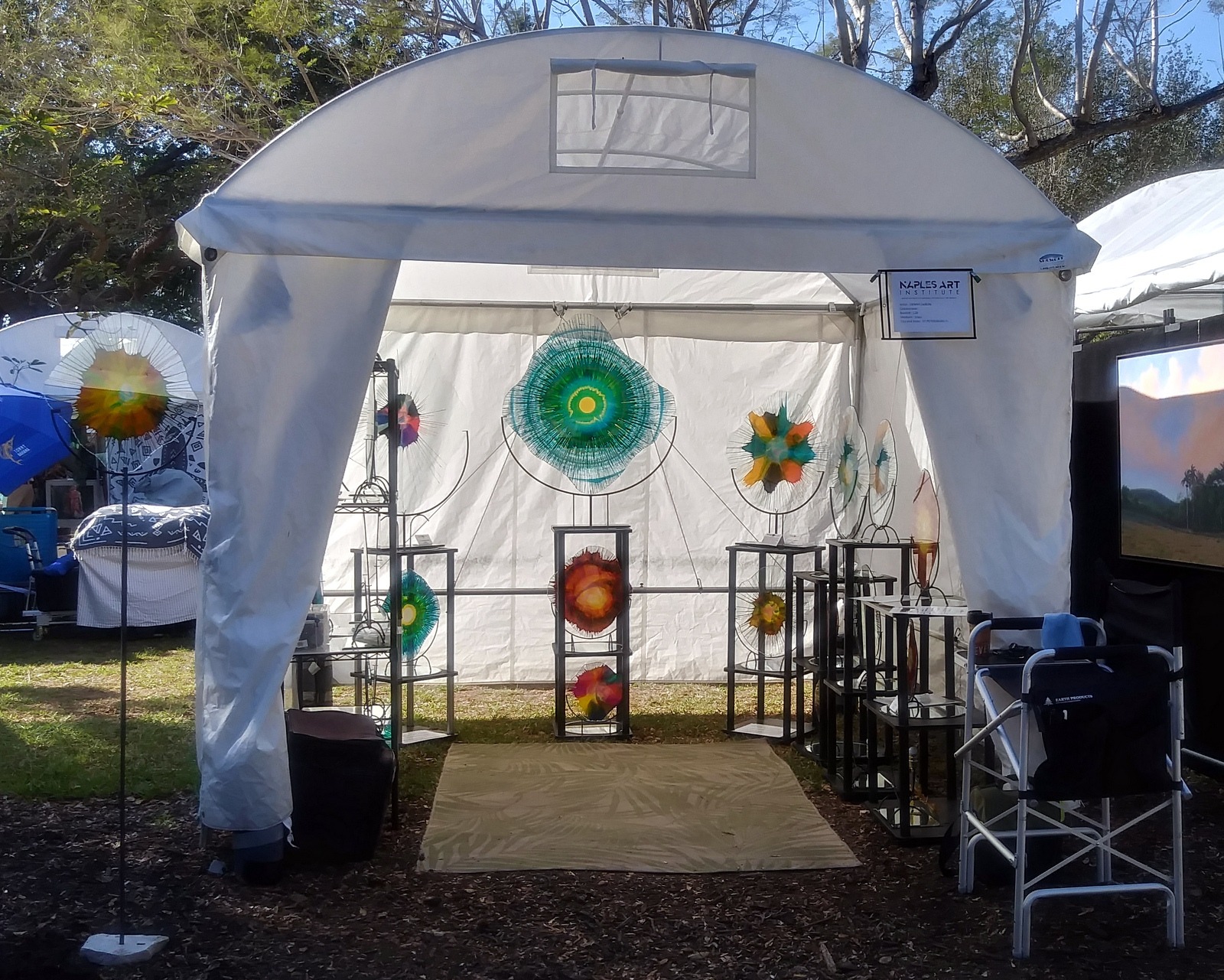 I drove down here from Saint Petersburg yesterday morning, dollied all of my booth supplies ( a Showoff tent, weights, pedestals, stands and rolling containers of all my glass artwork) into the park and set up my booth for the weekend art show.