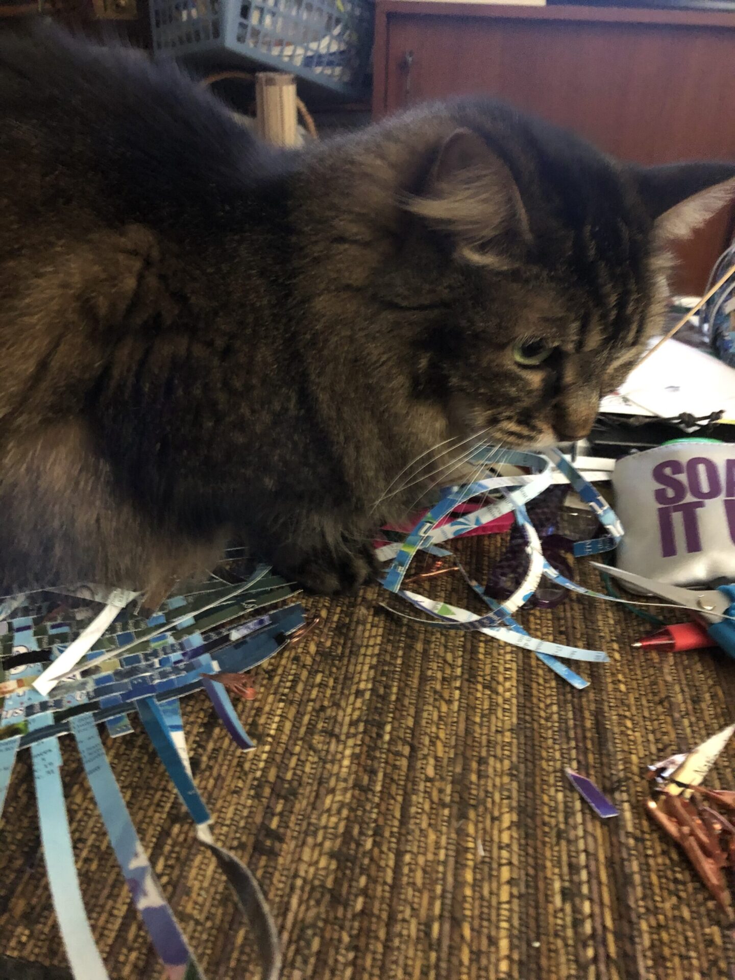 Our cat Squeaky likes to hang out with me when I’m weaving. She especially likes to claim anything I’m working on. Squeaky will plop herself down on anything on the floor. If it’s a true basket, she’ll sit in it…or think about how to get into it. If it’s flat, she will sleep on it until I shoo her off. I take things out of her mouth all the time!