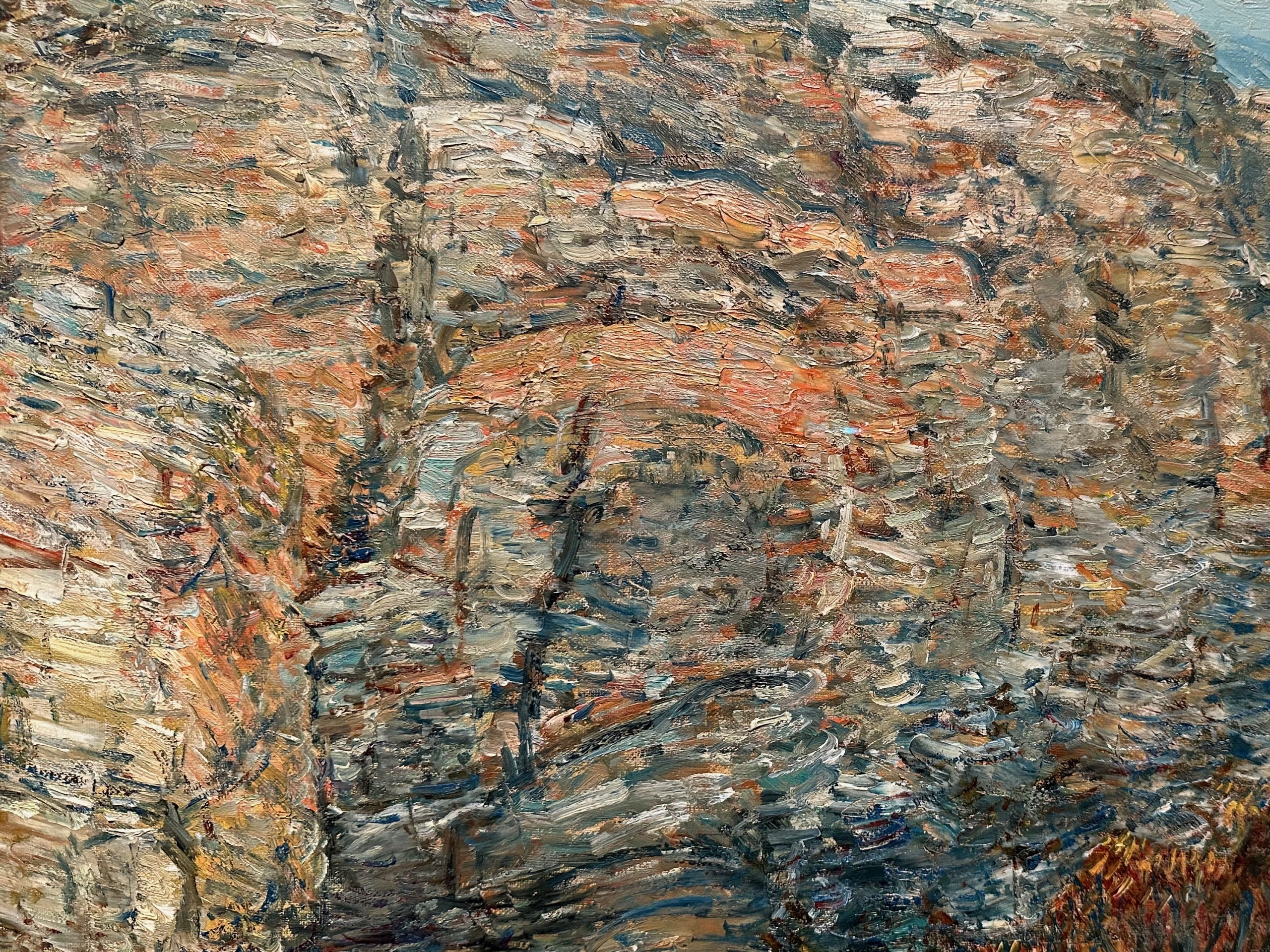 There must be hundreds if not thousands of dashes and spots of paint expertly modeling the rock’s many crevices, lumps, depressions and textured surface. The painting is a painter’s palette endlessly mixing and experimenting.