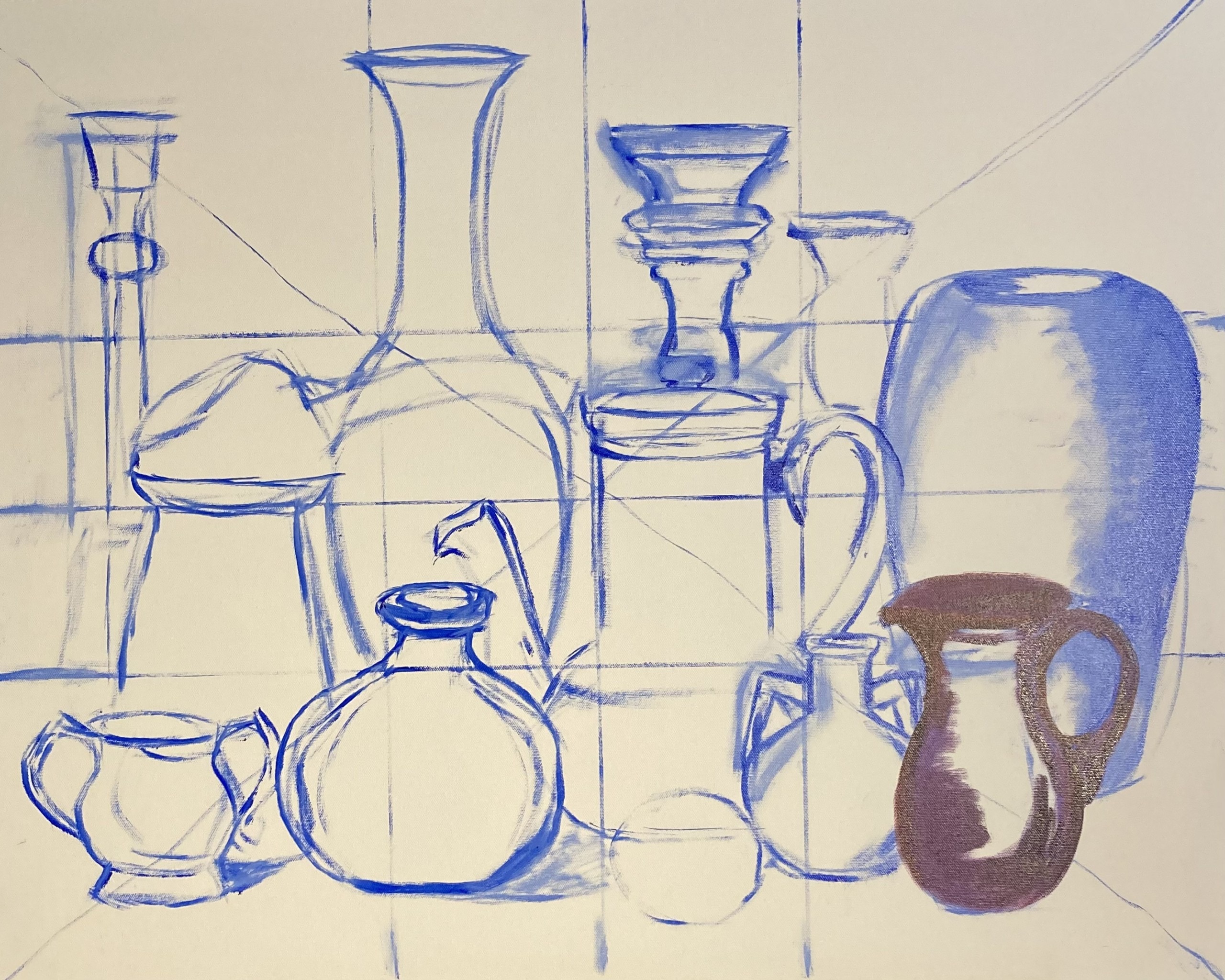 First, when confronting a pure white canvas, it is necessary to know the placement of the objects to be painted. The best way to do that is to use a three-part grid. Above you can see that I’ve established the grid on the canvas itself, in addition to using a clear grid to hold and look through. I can then sketch in the objects so that they are correctly sized in relation to the other objects and fit comfortably into the overall size of the canvas. Notice that because this painting will be using a predominant number of blues and purples, I’ve made the color of the grid and the sketch itself a blue tone. This allows for easy blending when the objects are painted in.