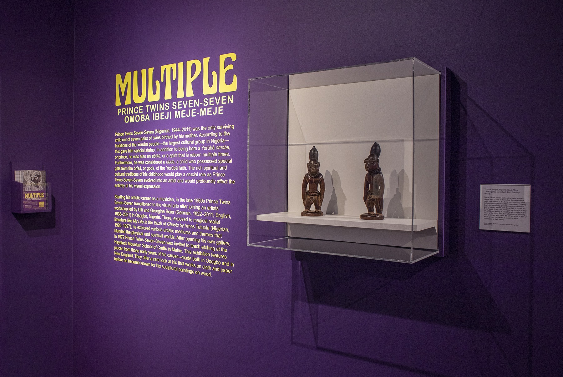 Hill-Thomas designed the “royal” space that I perceived as a brightly colored purple jewelry box accented in yellow to display 14 special pieces – 10 works on paper or cloth by Prince Twins Seven-Seven and four other Yorúbà sculptures from MFA’s collection.
