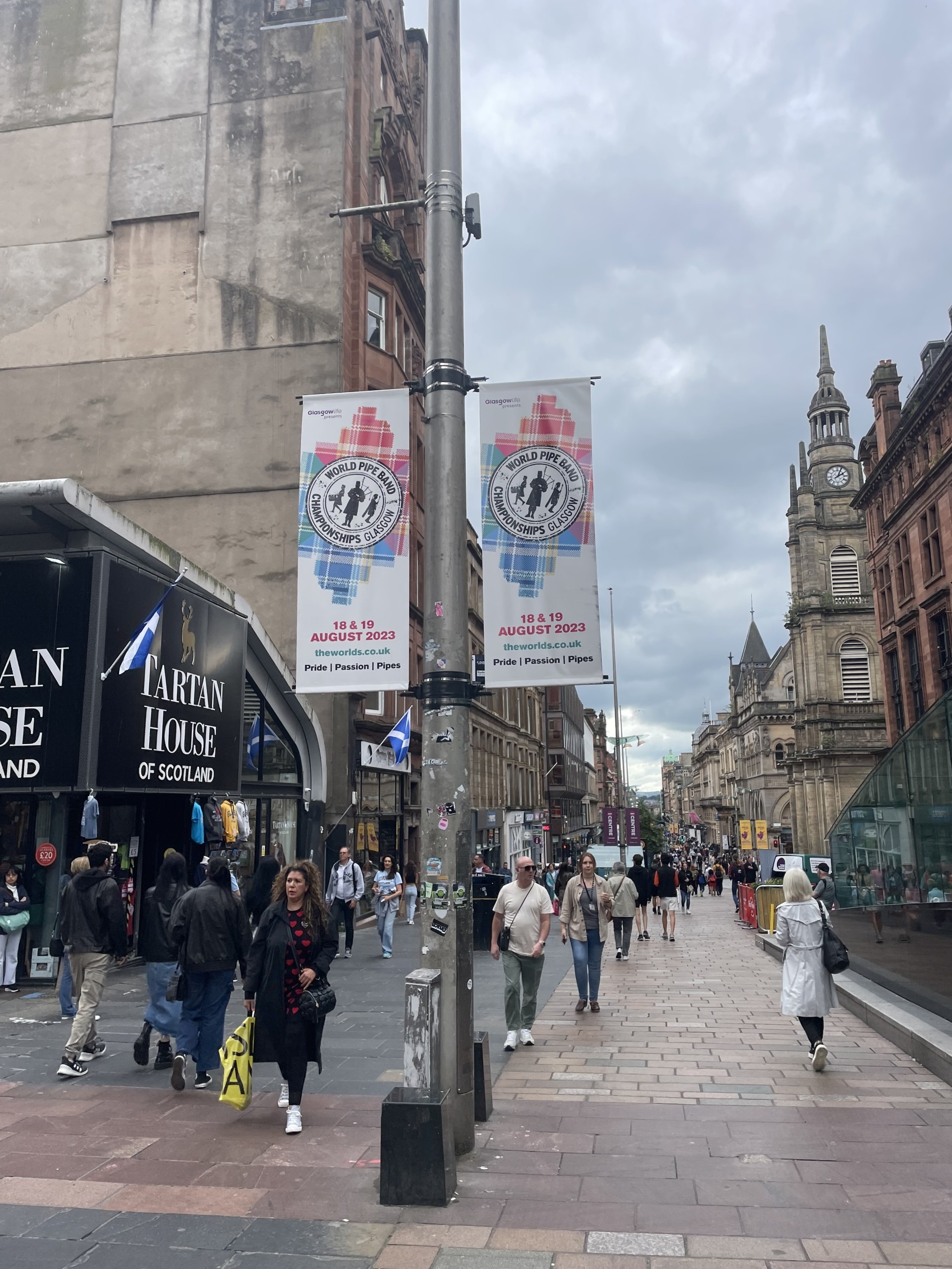 This year, the City of Dunedin Pipe Band was unable to travel over to participate in the event.  However, if I had stayed home, I think I might have gone stir crazy!  So I booked a shorter trip and secured a hotel within easy walking distance to the Glasgow Green, where the championship is held in Glasgow, and traveled over.  There’s always so much to learn from being there.  So many people love hearing the performances, but what I have always really enjoyed is watching bands warm-up and to observe their preparation process and appreciate the different ways that some of the world’s top pipers and and drummers pull their band together to deliver a great performance on the field.