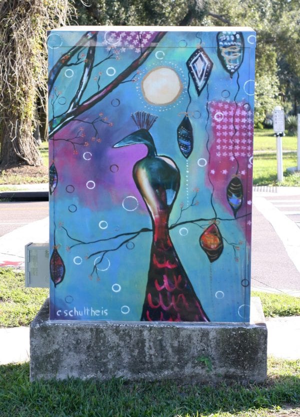 Clearwater Arts Alliance Public Art Installation The public art at the parking garage at 640 Pierce St. in downtown Clearwater features the work of one of CAA’s selected signal box artists, Candy Schultheis. An award-winning artist based in Dunedin, Schultheis has shown her work throughout Rhode Island and Florida, including many solo shows and she teaches at the Dunedin Fine Arts Center. Her work is currently on exhibit at DFAC, Celestial Circle in Palm Harbor, and in her studio, CanLo Studio. For more information about the “Thinking Outside the Box” project, or to sponsor a new art installation on a signal box, please contact the Clearwater Arts Alliance at info@clearwaterartsalliance.com or call us at 727-245-0077.