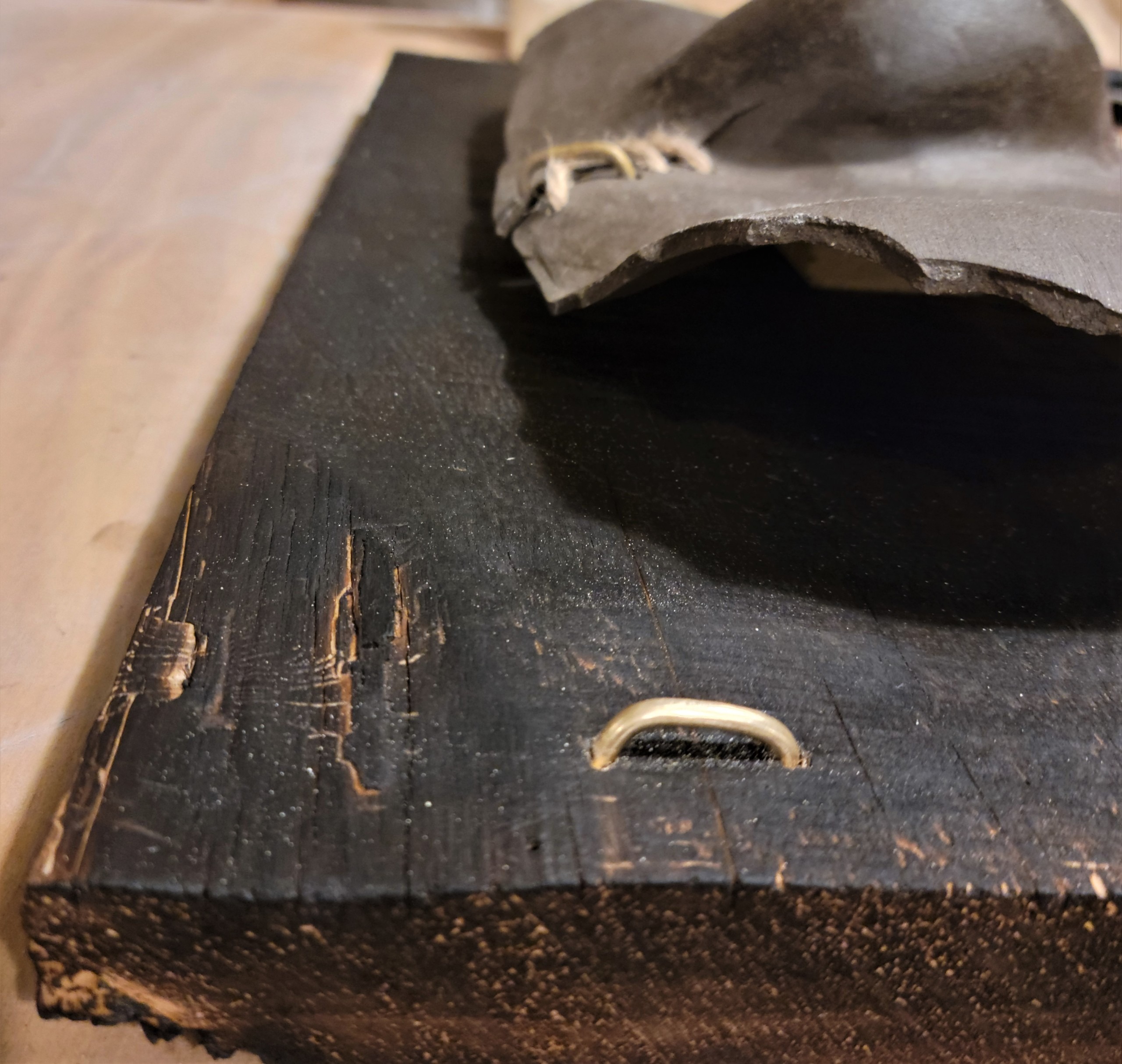 I found this beautiful red wood slab that I cut into a fitting size. That night, I was determined to finish my vision. I sanded and torched the surface of the wood to not only seal, but bring out the deeper tones and textures. After finishing the surface with an oil, I added similar copper staples to specific wood seams, as I did in the body piece.