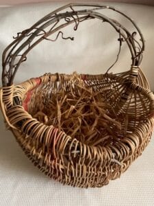 I’ve been weaving baskets on and off for at least 30 years! My first class was at the University of South Florida Craft Studios in the Student Union in the late ’80s or early ’90s. My instructor brought supplies and taught one style of basket: Appalachian style egg or potato baskets in natural round reed with grapevine handles and god’s eyes.