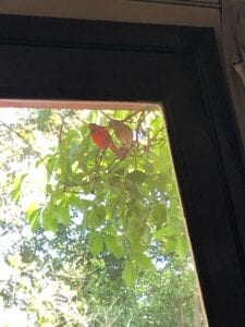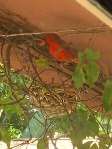 – And The Cardinals: A pair of cardinals that flew around my garden last spring looking for a place to build a nest. After a few days of watching their attempts, I made them a “bird nest” basket and attached to vines underneath the eaves of the house with sandwich ties. The birds moved in and raised two hatchlings.