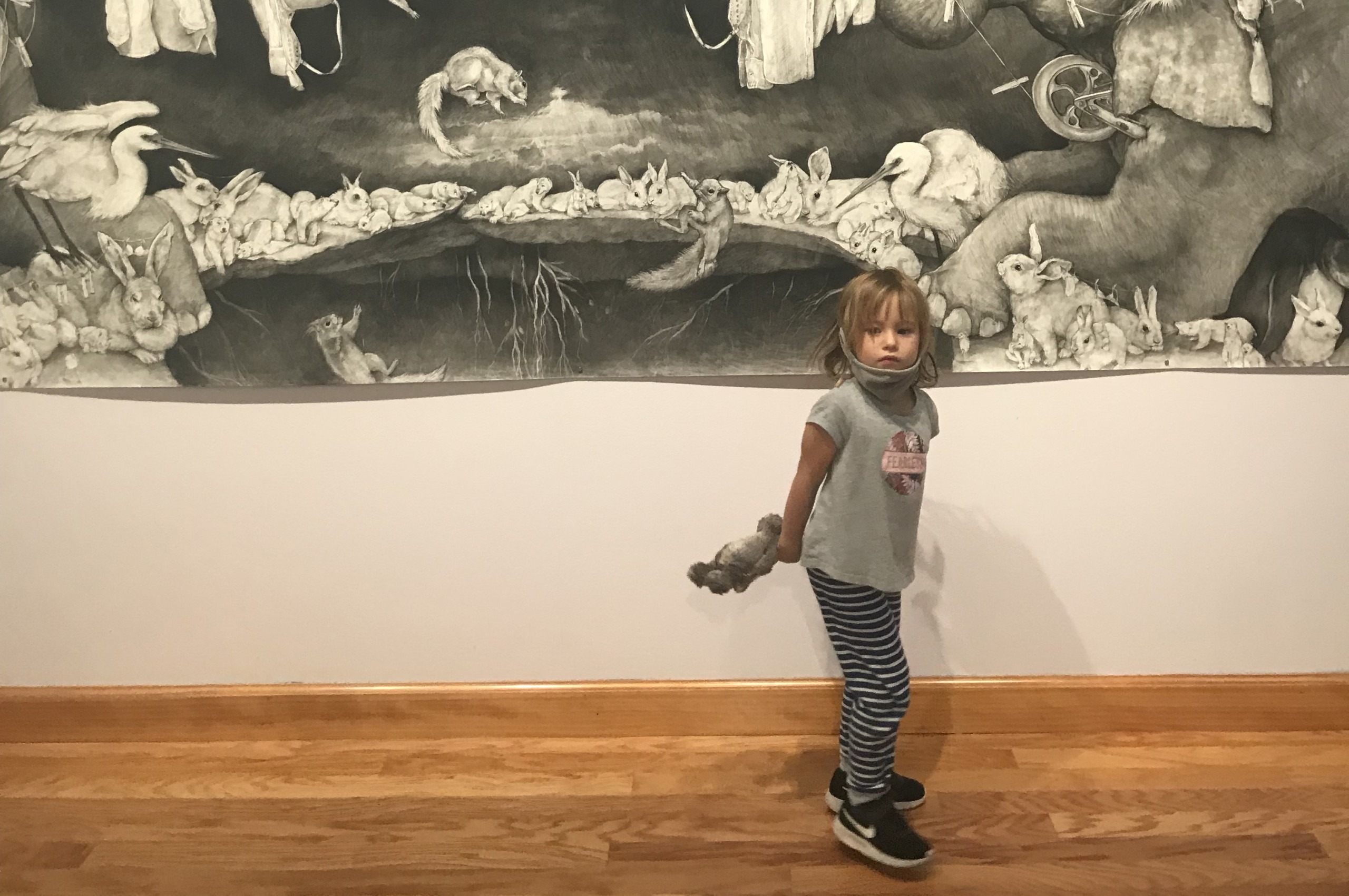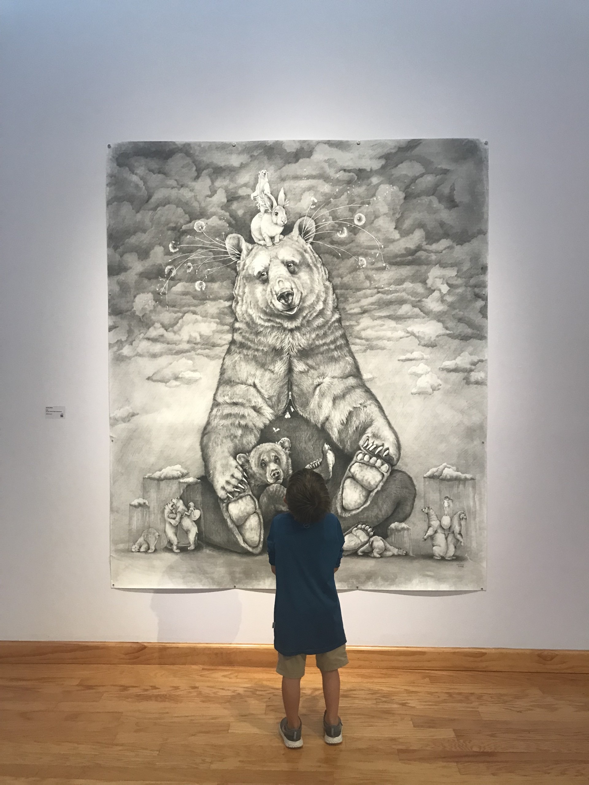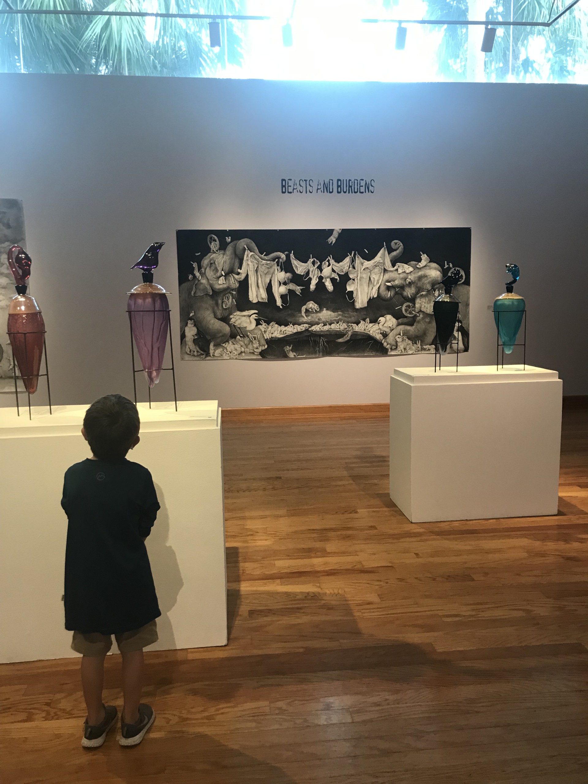 My troupe actually help me “see” art in a different way. They have a knack for unfiltered honesty. It was a cold and overcast day when I took my three kids to the Beasts and Burdens exhibit at the Dunedin Fine Art Center.  William, age 6 1/2 (don’t forget the half) looked at one of Adonna Khare