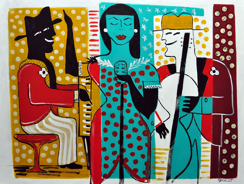 Music is quite influential to my painting. Be it a title, a lyric or melody, it often sets or supports the tone and pace of my work. I listen to almost every style there is. I like to create Jazz-themed or abstract pieces to the tunes of John Coltrane, Charlie Parker or Max Roach.