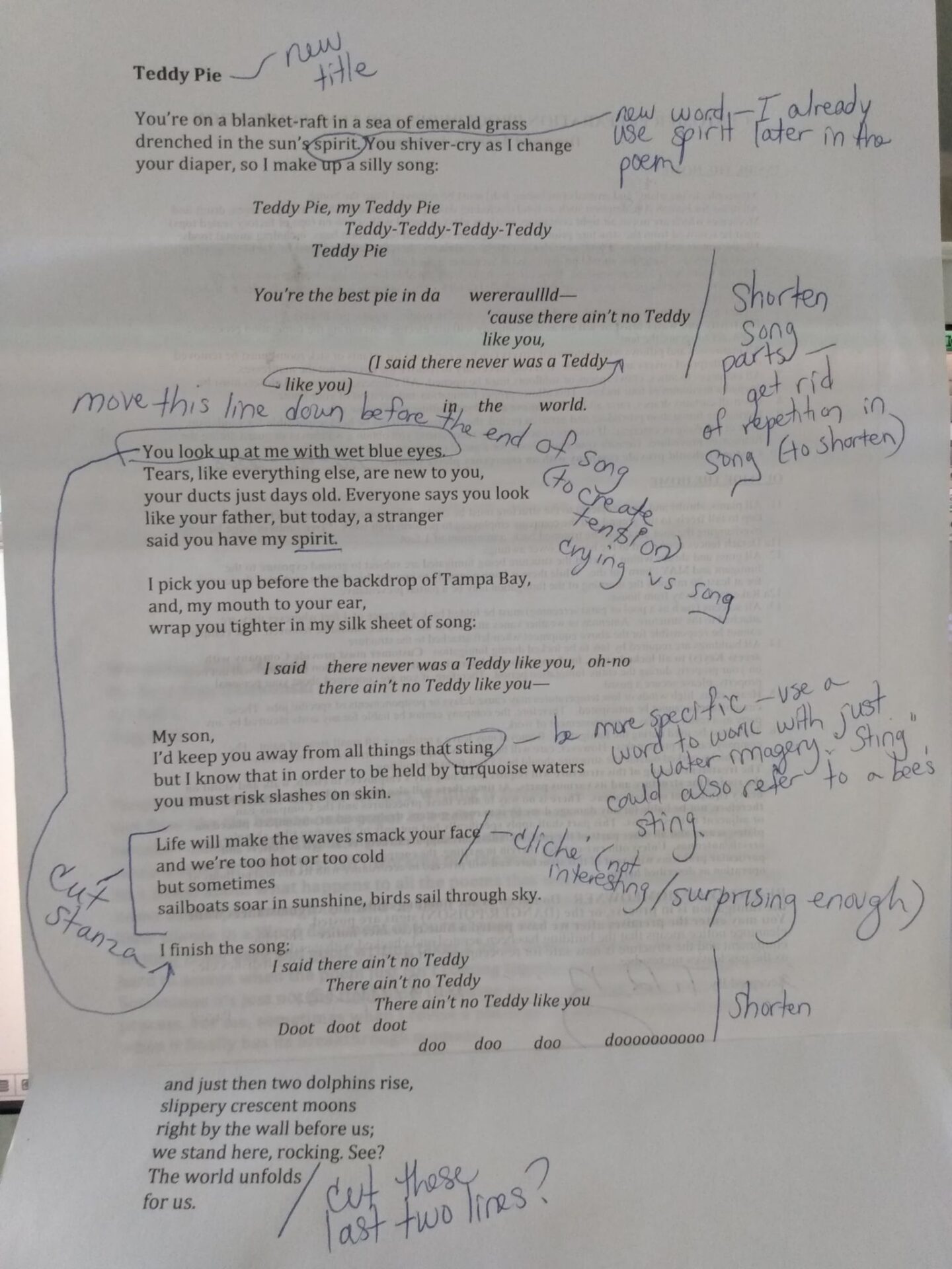 People often think that for writers, the words just flow like the breeze onto paper in a near-perfect way and after a couple of tweaks—Boom, a shining new piece. I often hear young writers get discouraged when a story or poem just isn’t coming together the way they want it to. (There should be a poem about what happens to all the poems that are abandoned because they never developed enough to stand on their own, and so they grow old and shriveled in their silence in a Word document or journal page and never meet the world.) Writing is not easy and good writing takes a lot of drafts, patience, and time. It’s hard to accept when the poem just isn’t coming together in a powerful or magical way. Sometimes it’s just not the right time. Of course, every writer has their own unique process. For me, sometimes when I revise a poem years after the initial drafts, that’s when it finally has its breakthrough moment.
