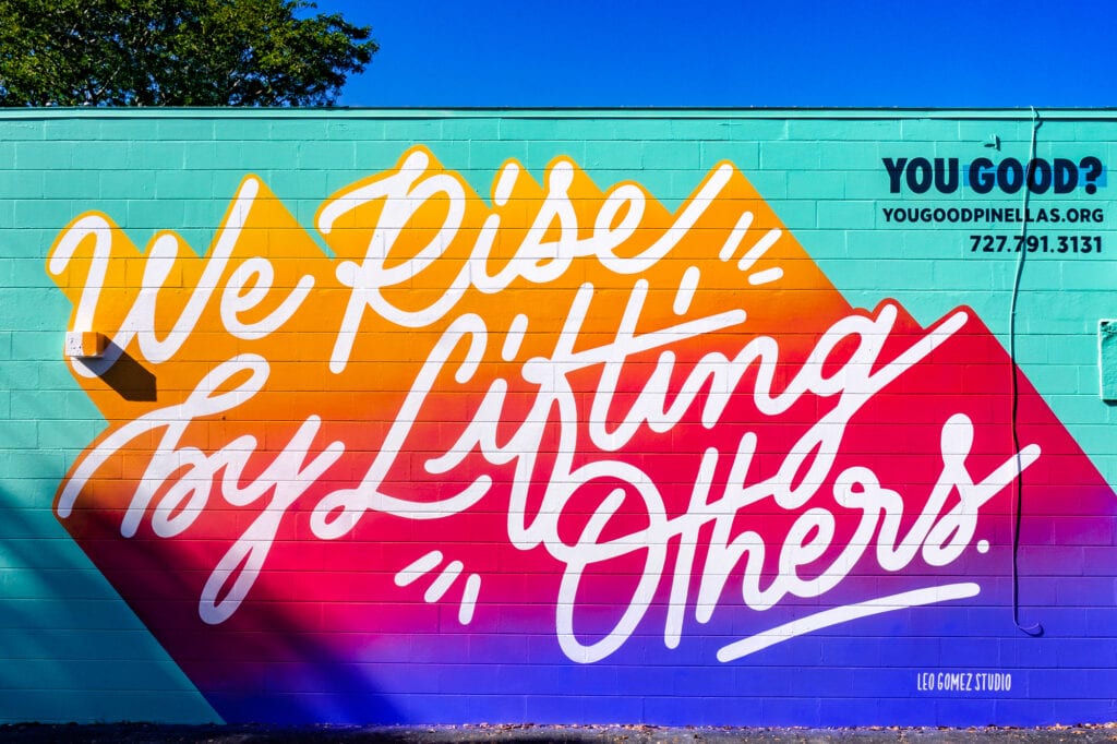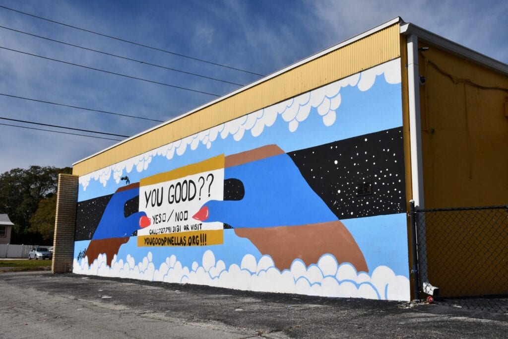 To harness the power of art in public spaces, SHINE was invited to facilitate four You Good? murals throughout St. Petersburg. Four local artists were selected, Briauna Walker (Tampa), Jimmy Breen (St. Pete), James Freeman Kitchens (Clearwater) and Leo Gomez (St. Pete). They were each tasked with creating a mural in their own design style that speaks to the message of mental health.