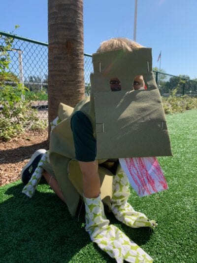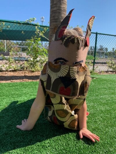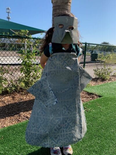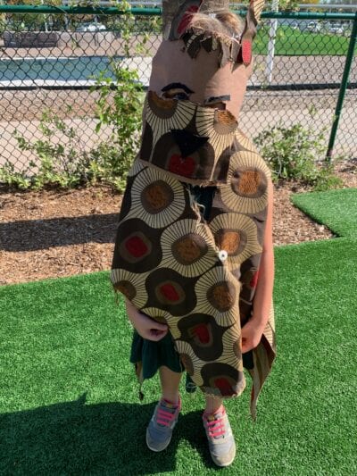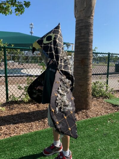So each child chose an animal and drew out a blueprint of what they thought it might look like. Next we asked each child what kinds of materials they might need to make this costume. After thinking some things through we began. We were intentional about using recycled materials and whatever we had around. The cloth was just extra cloth and so we chose a design that best represented the character of the animal. I help the kids drape cloth and cut cloth and attach things using hot glue. A lot of hot glue was used.
