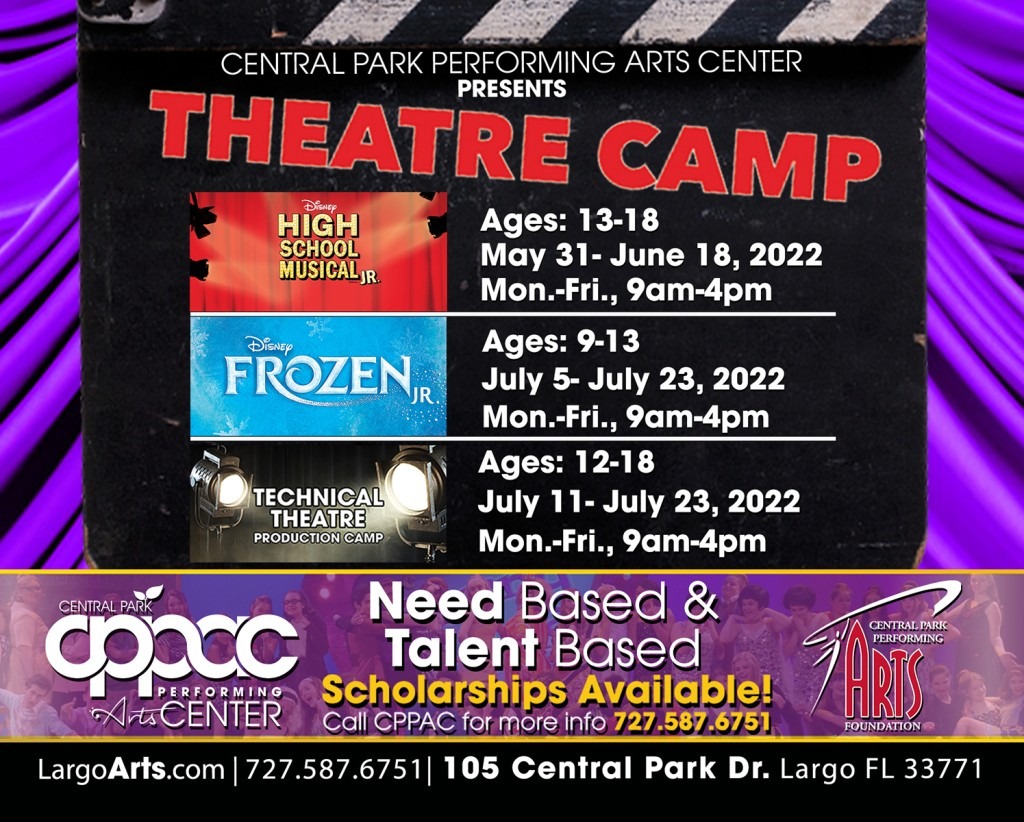Central Park Performing Arts Center is located at 105 Central Park Dr., Largo FL 33771, 727-587-6751. To sign up for Theatre camps, visit largoarts.com.